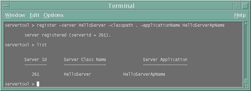 The servertool registers the server, assigns it the name of "HelloServerApName", and displays its server id: